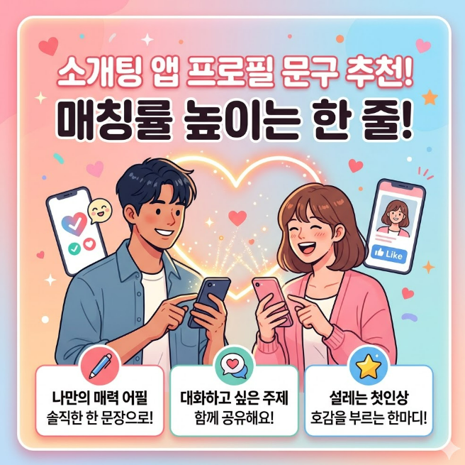 소개팅 앱을 사용할 때 가장 고민되는 부분 중 하나는 바로 짧은 문구입니다. 길게 쓰는 자기소개보다 오히려 한두 줄의 문장이 더 강한 인상을 남기기도 하기 때문입니다. 그래서 많은 사람들이 “소개팅 프로필 잘 쓰는 법”, “매칭률 높이는 방법”, “진지한 만남 시작하는 법” 같은 키워드를 검색하면서 소개팅 앱 프로필 문구 추천을 찾고 있습니다.