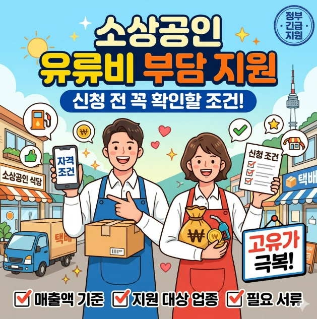 사업자등록 여부, 실제 영업 여부, 매출 규모, 업종, 차량 사용 여부, 유류비 지출 증가 여부, 기존 지원금 중복 여부를 확인해야 합니다. 특히 소상공인 지원은 업종 제한, 매출 기준, 신청 기간이 정해져 있는 경우가 많아 늦게 확인하면 대상이어도 신청하지 못할 수 있습니다.