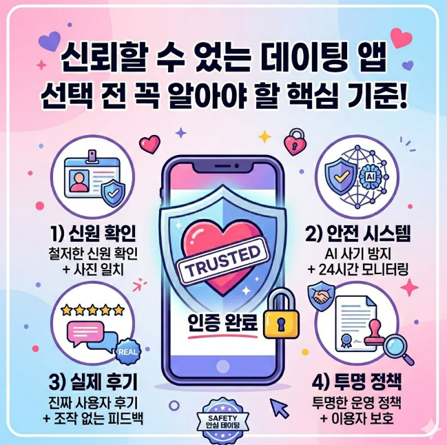 결국 데이팅 앱은 사람만 믿을 것이 아니라, 서비스 운영 방식 자체도 믿을 수 있어야 합니다. 그런 점에서 신뢰할 수 있는 데이팅 앱은 단순히 사람을 많이 보여주는 앱이 아니라, 이용 구조 자체가 납득 가능하고 투명한 앱이어야 합니다.