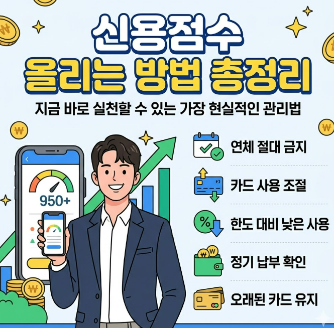 신용점수를 올리는 가장 좋은 방법은 복잡하지 않습니다. 연체를 만들지 않고, 대출을 무리하게 늘리지 않고, 카드와 계좌를 안정적으로 관리하고, 제출 가능한 긍정정보를 빠짐없이 반영하는 것이 핵심입니다. NICE와 KCB의 공식 안내를 종합하면, 신용점수는 상환이력과 부채수준, 카드 사용 패턴, 거래 기간, 비금융·마이데이터 정보의 영향을 받으므로 생활 속 습관이 그대로 점수에 연결된다고 볼 수 있습니다.