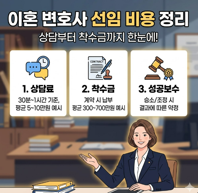 이혼을 준비하거나 이미 갈등이 깊어진 상황에서 가장 많이 검색하는 주제 중 하나가 바로 이혼변호사 선임 비용입니다. 협의이혼으로 끝날 줄 알았는데 재산분할, 양육권, 양육비, 위자료 문제까지 얽히면 비용이 얼마나 들지 걱정이 커질 수밖에 없습니다. 특히 상담을 받아보면 상담료, 착수금, 성공보수, 인지대, 송달료처럼 항목이 여러 가지로 나뉘어 있어 처음 접하는 분들은 더 혼란스럽게 느끼기 쉽습니다.