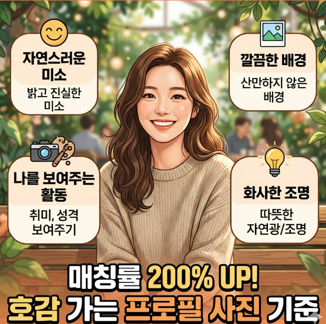 지금 프로필 사진을 고민하고 있다면, 오늘 알려드린 호감 가는 프로필 사진 기준으로 한 번 점검해보세요. 작은 변화가 매칭 결과를 바꿀 수 있습니다.